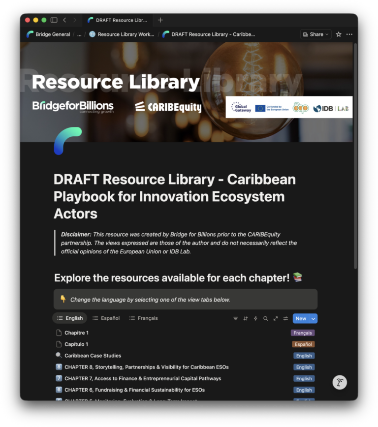 This is a practical guide for the organizations shaping entrepreneurship and innovation across the region. It is a core knowledge product of CARIBEquity Conecta Caribbean, CARIBEquity’s capacity-building initiative for innovation ecosystem actors, co-funded by the European Union and IDB Lab. Developed as part of CARIBEquity, the Playbook responds to a shared reality: ecosystem actors across the Caribbean are working in fragmented markets, with limited resources, and in contexts shaped by climate vulnerability, migration, and small market size — often without tools designed for these conditions.